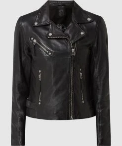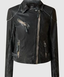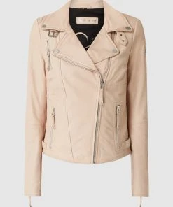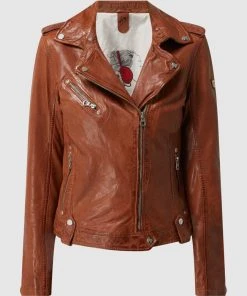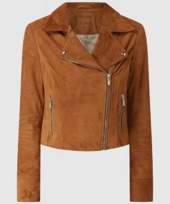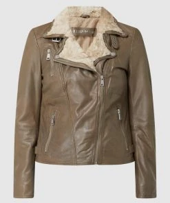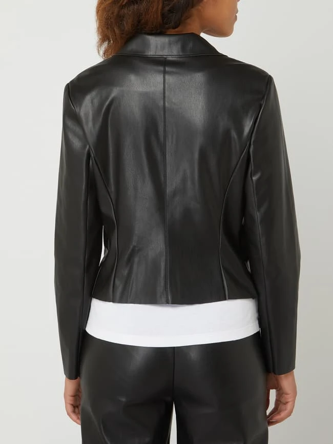 Die Jacke von BETTY & CO. kommt in Leder-Optik und ist schmal geschnitten. Sie zeigt sich im Biker-Look mit Umlegekragen, verdecktem Reißverschluss und Eingrifftaschen.