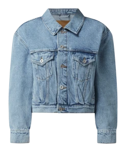 Die Jeansjacke von ONLY ist aus reiner Baumwolle gefertigt. Sie kommt in verkürzter Passform mit Umlegekragen, Knopfleiste und Destroyed-Effekten.