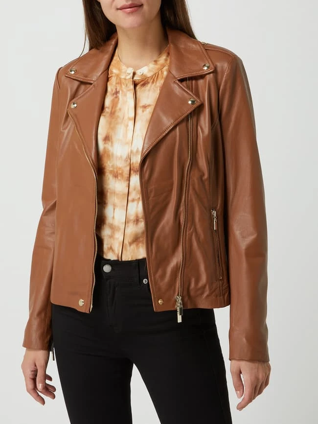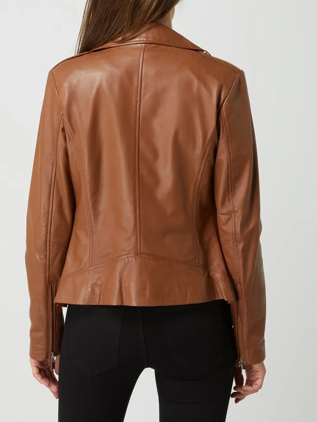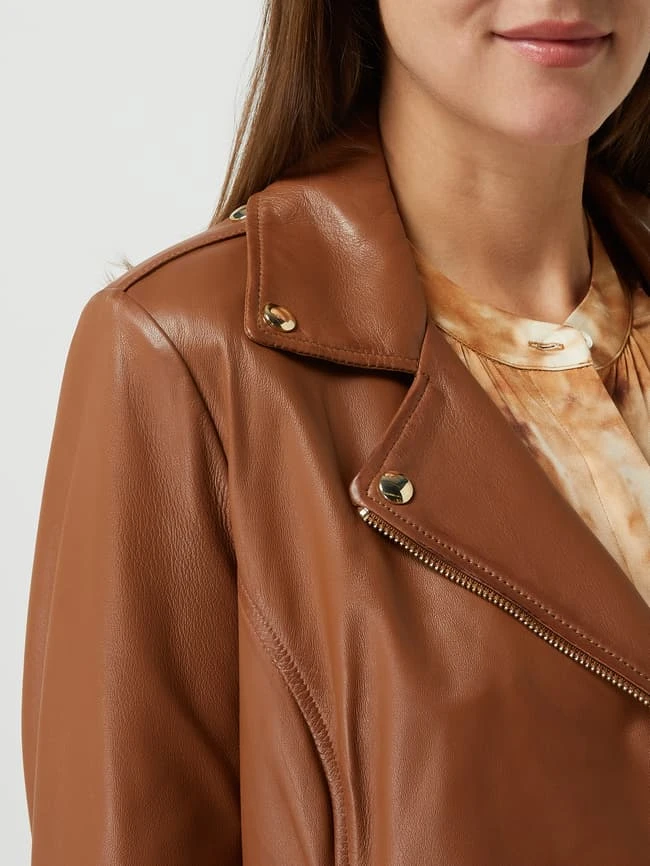 Die Lederjacke von Repeat ist aus echtem Leder gefertigt und tailliert geschnitten. Sie zeigt sich im Biker-Look mit breitem Reverskragen, asymmetrischem Reißverschluss und Reißverschlusstaschen.